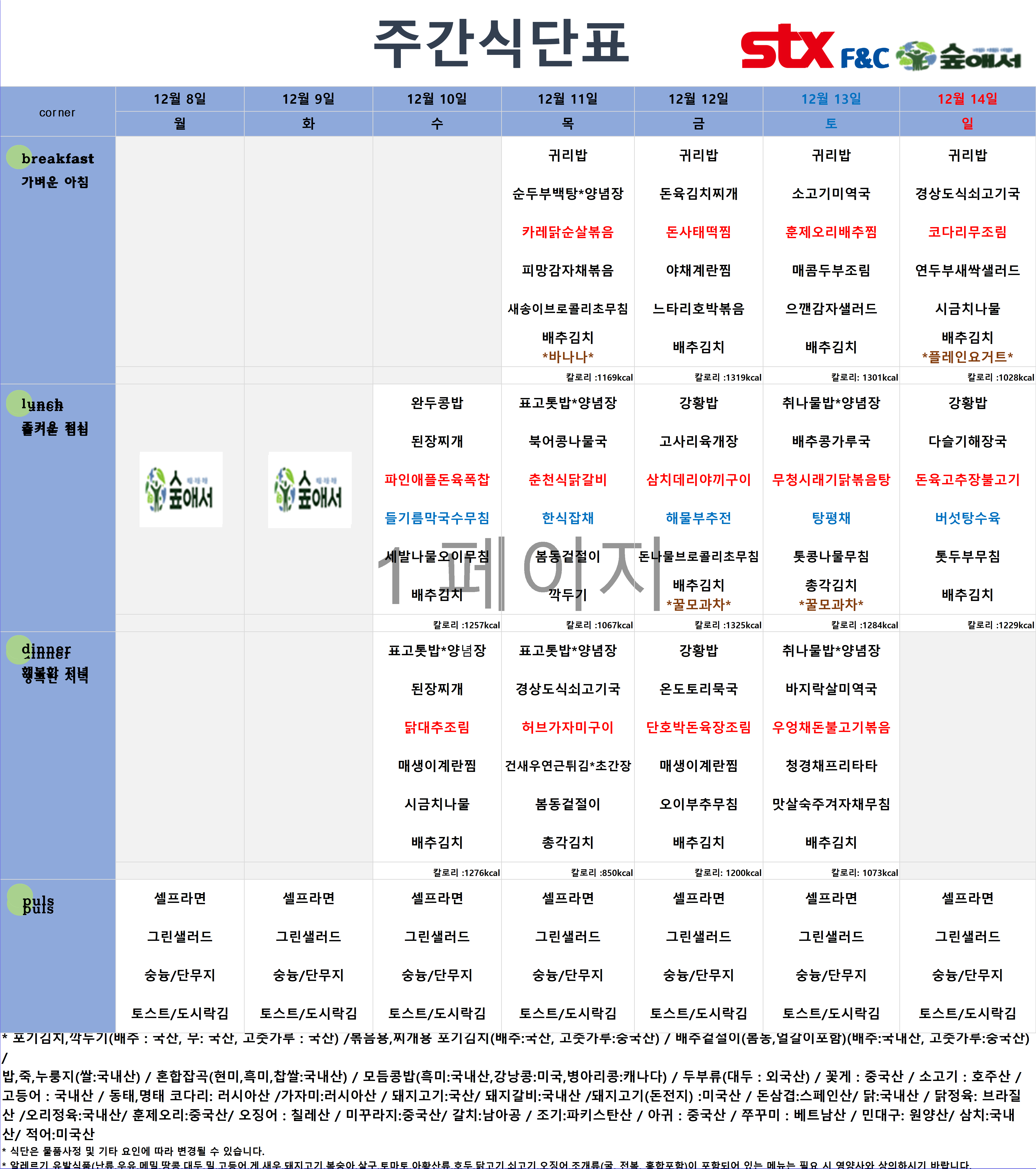 안녕하세요. 숲애서입니다. 2025/12/1 ~ 12/14 식단예정표 안내드립니다. *상기 식단은 물품사정 및 기타 요인에 따라 변경 될 수 있습니다. *특정 식품에 알러지가 있는 고객께서는 반드시 식사 전 문의하여 주시기 바랍니다. |