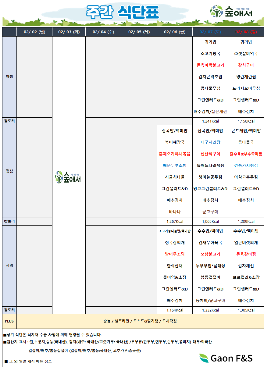 안녕하세요. 숲애서입니다. 2026/2/2 ~ 2/8 식단예정표 안내드립니다. *상기 식단은 물품사정 및 기타 요인에 따라 변경 될 수 있습니다. *특정 식품에 알러지가 있는 고객께서는 반드시 식사 전 문의하여 주시기 바랍니다. |