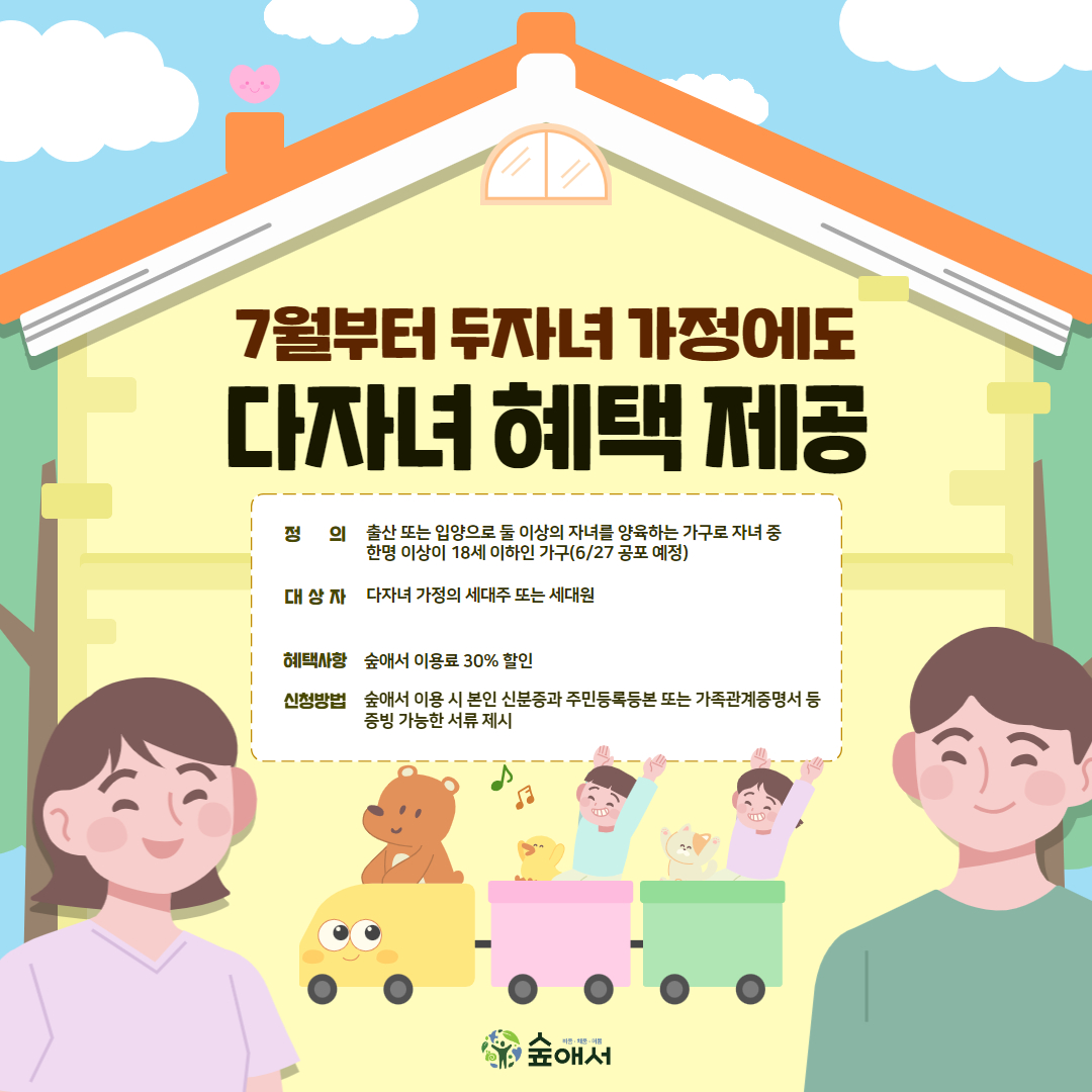 안녕하세요, 숲애서입니다! 7월부터 두자녀 가정에도 '다자녀 혜택' 이용료 30% 할인을 제공합니다. 다자녀 가정은 '출산 또는 입양으로 둘 이상의 자녀를 양육하는 가구로서 자녀 중 한명 이상이 18세 이하인 가구' 입니다.