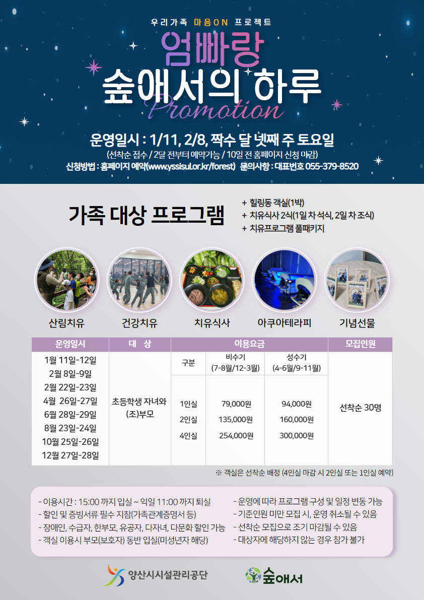 안녕하세요. 숲애서입니다. 2025년 '엄빠랑 숲애서의 하루' 운영 안내드립니다. 동절기에 2회차 추가 개설되었으니 많은 관심 부탁드립니다. 자세한 사항은 아래 포스터를 참고해 주세요.