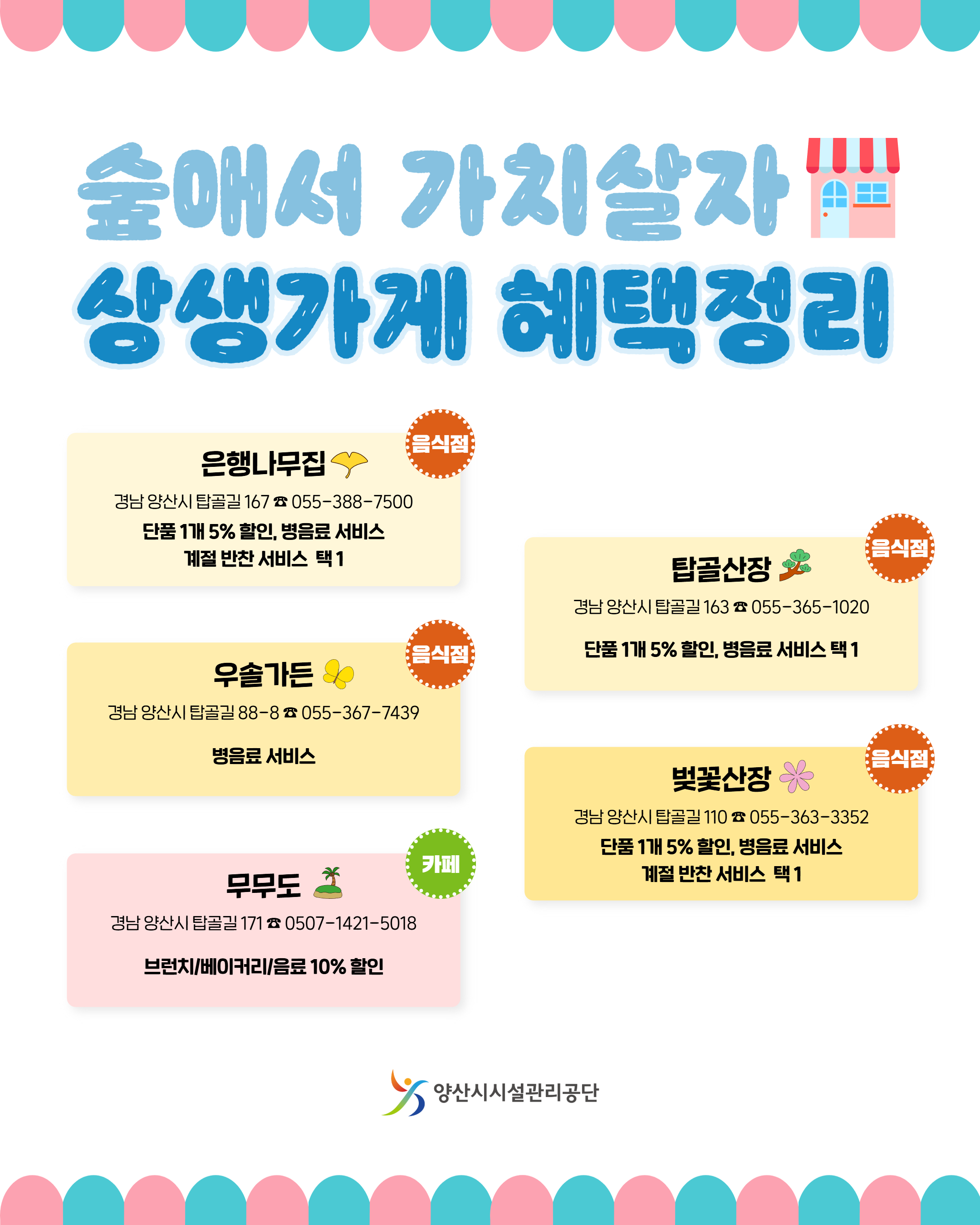 안녕하세요, 숲애서입니다! 지역상생과 인근 가게 경제활성화를 위해 ‘숲애서 가치(같이) 살자’ 프로젝트가 5월 12일부터 진행됩니다. 쿠폰을 요청하시는 모든 고객분들께 인근 가게 서비스 이용권을 드립니다! 사용 가능한 가게는 아래와 같습니다. 또한 가게 문 앞에 ‘숲애서 가치살자 상생가게’ 스티커가 붙어있어요. 주문 시 쿠폰 사용 여부를 먼저 여쭤 봐주시면 원활한 소통이 가능할 것 같습니다! - 아 래 - 음식점 1. 은행나무집(경남 양산시 탑골길 167 ☎ 055-388-7500) - 대표메뉴 : 오리불고기, 향어, 매운탕, 백숙 등 2. 탑골산장(경남 양산시 탑골길 163 ☎ 055-365-1020) - 대표메뉴 : 오리불고기, 향어, 매운탕, 백숙 등 3. 우솔가든(경남 양산시 탑골길 88-8 ☎ 055-367-7439) - 대표메뉴 : 오리불고기, 오리훈제, 백숙, 옹심이 등 4. 벚꽃산장(경남 양산시 탑골길 110 ☎ 055-363-3352) - 대표메뉴 : 오리불고기, 향어, 매운탕, 백숙 등