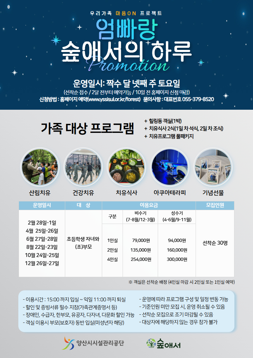 안녕하세요. 숲애서입니다. 2026년 '엄빠랑 숲애서의 하루' 운영 안내드립니다. 자세한 내용은 아래 포스터를 참고해 주세요. |
