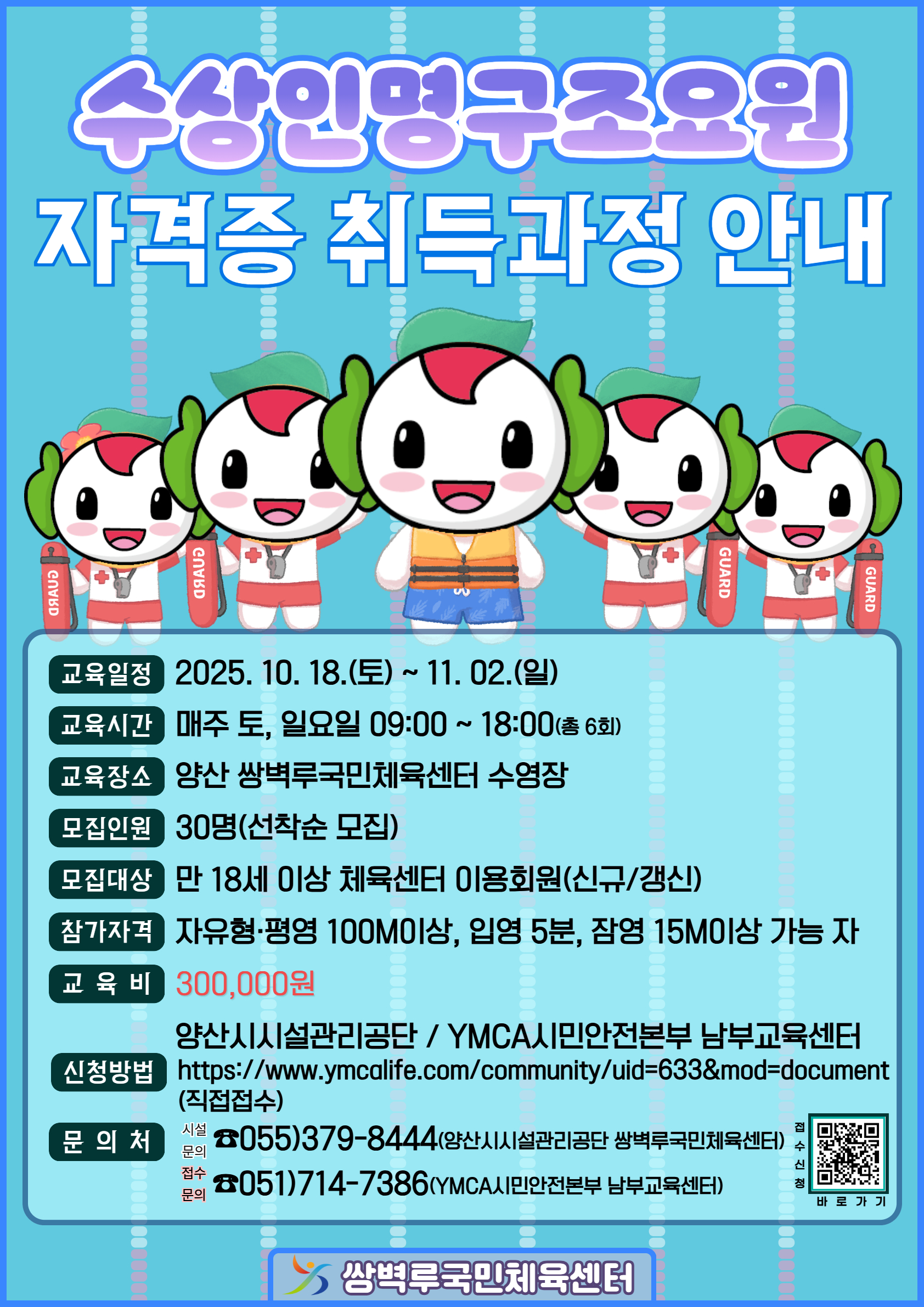 양산 쌍벽루국민체육센터 수영장에서 수상인명구조요원 자격증 취득과정이 진행되어 접수 안내드립니다!