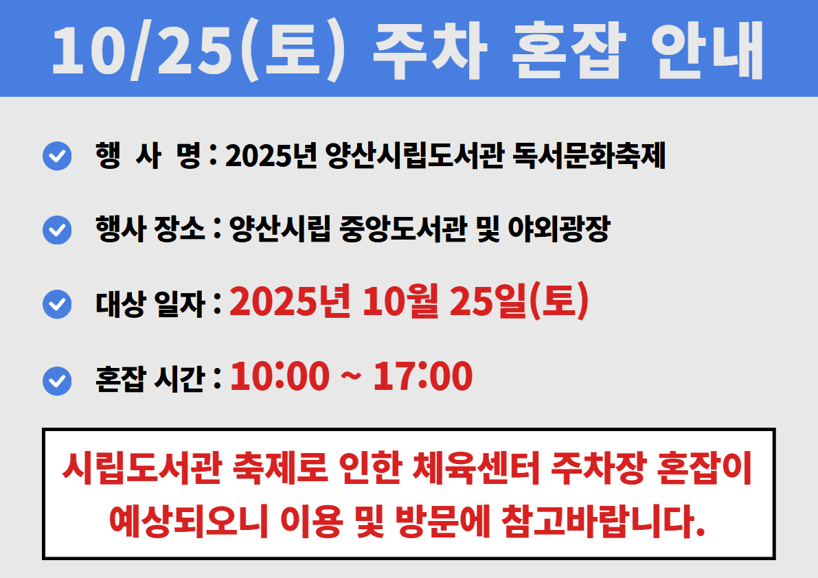 양산중앙국민체육센터 주차장이 혼잡할 수 있으니 이용 및 방문에 참고 부탁드립니다