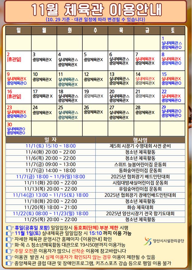 [2025년 11월 양산중앙국민체육센터 체육관 이용안내]