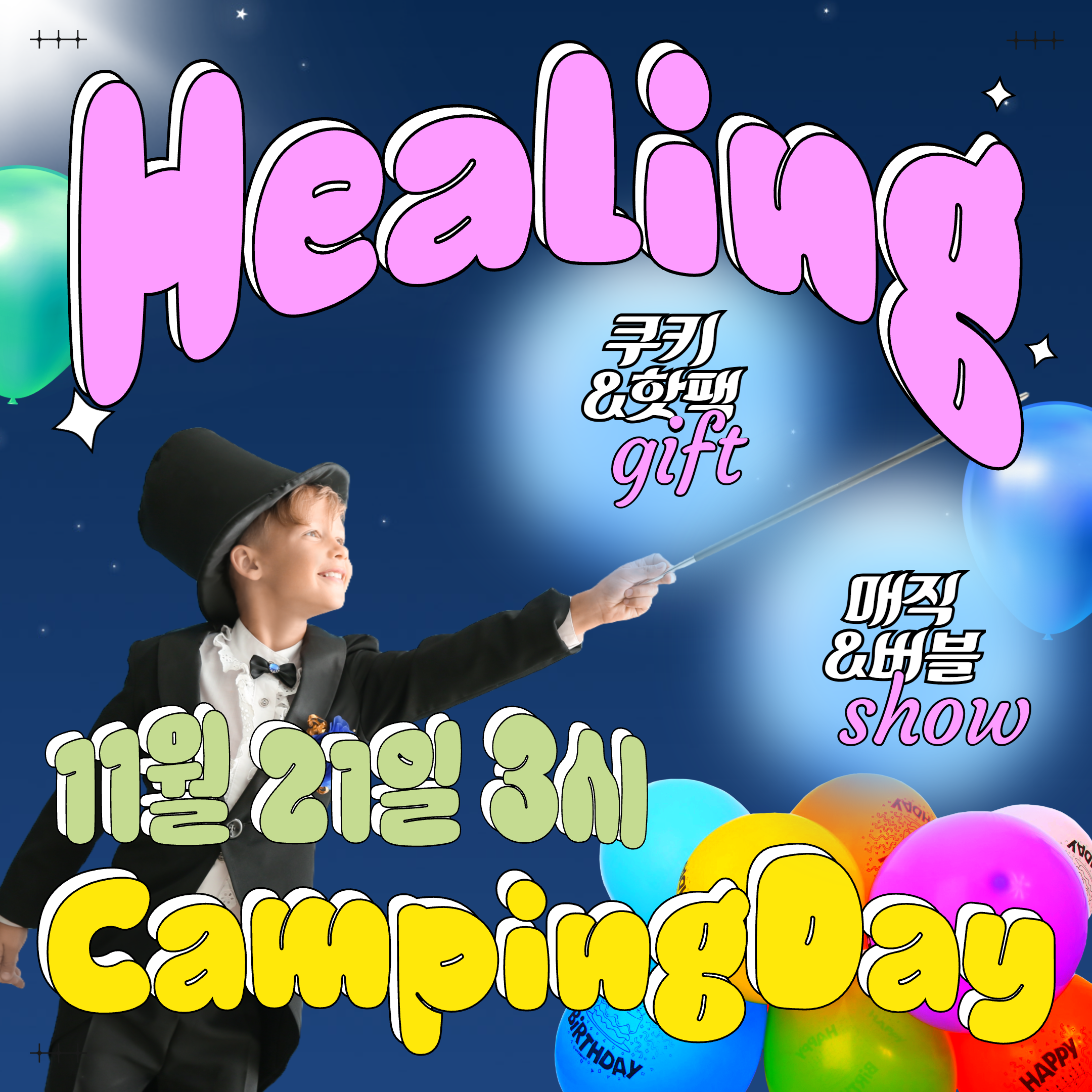 다음주 금요일, 11월 21일 15시 '힐링 캠핑 데이' 이벤트를 진행할 예정입니다.마술사와 함께 하는 마술공연과 다과와 핫팩 나눔 행사가 있을 예정이니