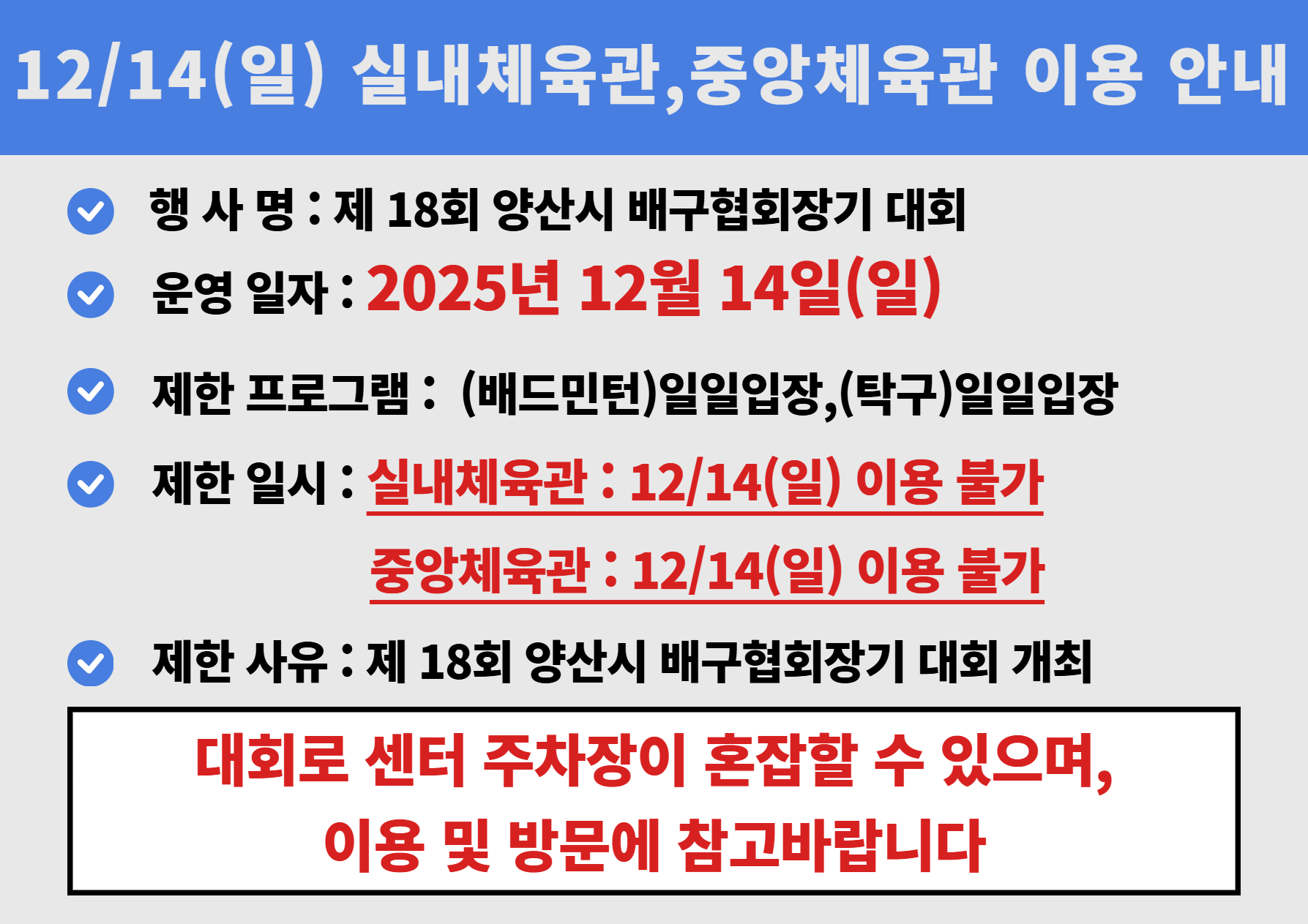 양산중앙국민체육센터 실내체육관,중앙체육관, 배구연습장에서 진행되는 제18회 양산시 배구협회장기 대회에 따라2025년 12월 14일(일) 09:00부터 18:00운영기간 내 실내체육관 및 중앙체육관 배드민턴(탁구) 일일입장이 불가합니다.또한 12월 14일(일) 09:00부터 18:00 대회 운영간 약 200명의 방문객이 방문할 예정으로 센터 주차장이 혼잡할 수 있으니 이용 및 방문에 참고 부탁드립니다.즐거운 하루되세요!