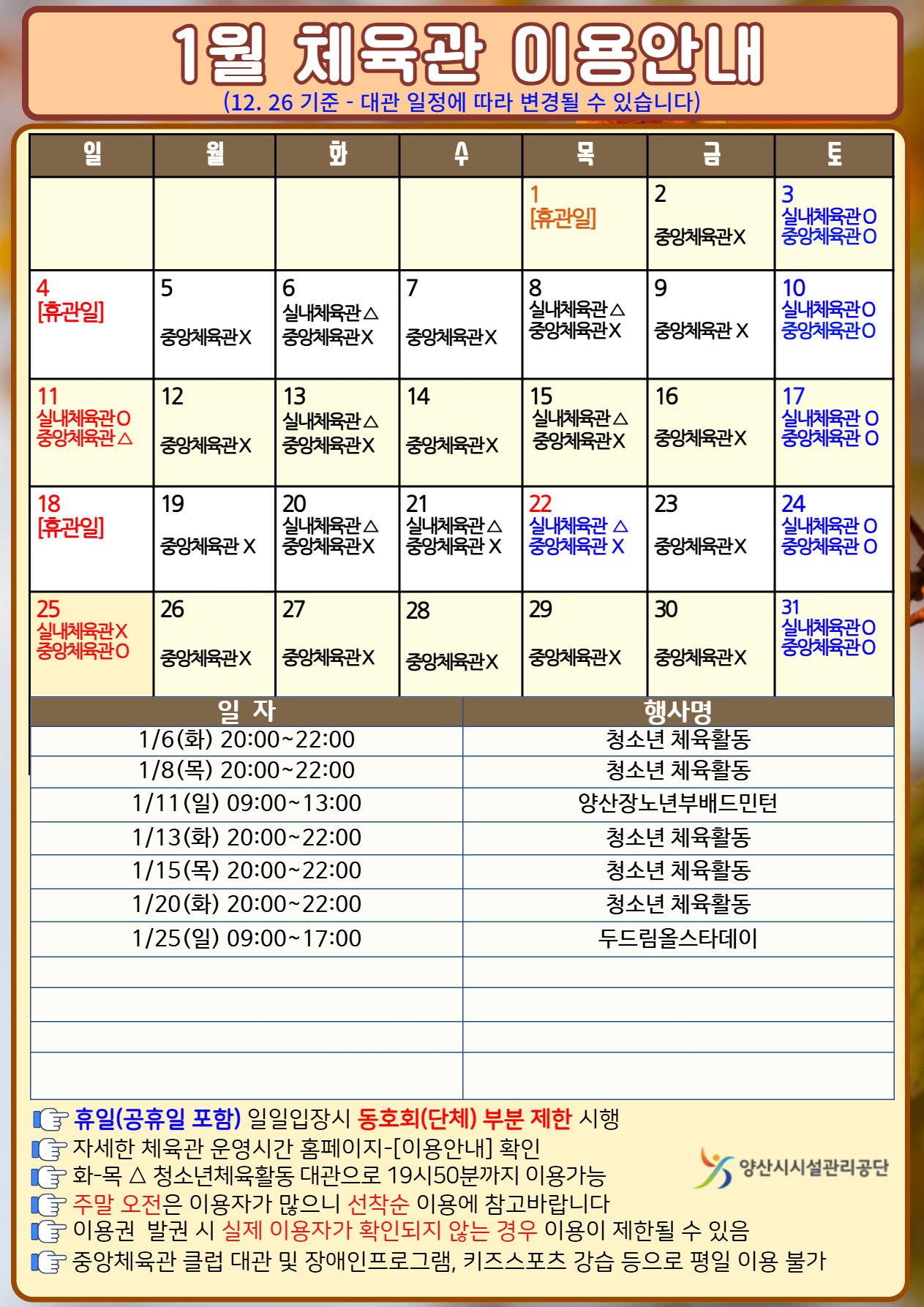 2026년 1월 양산중앙국민체육센터의 실내체육관 및 양산중앙체육관 이용 안내드립니다.화-목요일 청소년체육활동시 일정관련 협의를 통해 19시50분까지 일일입장이용 가능합니다.평일 중앙체육관은 클럽 대관 및 장애인 프로그램, 키즈스포츠클럽 강습 등으로 이용이 불가합니다.방문 전 일별 체육관 개방시간을 확인 후 이용바랍니다.감사합니다.