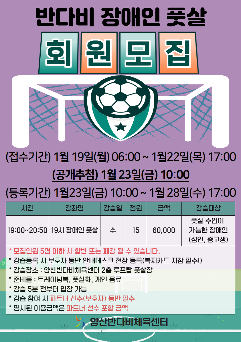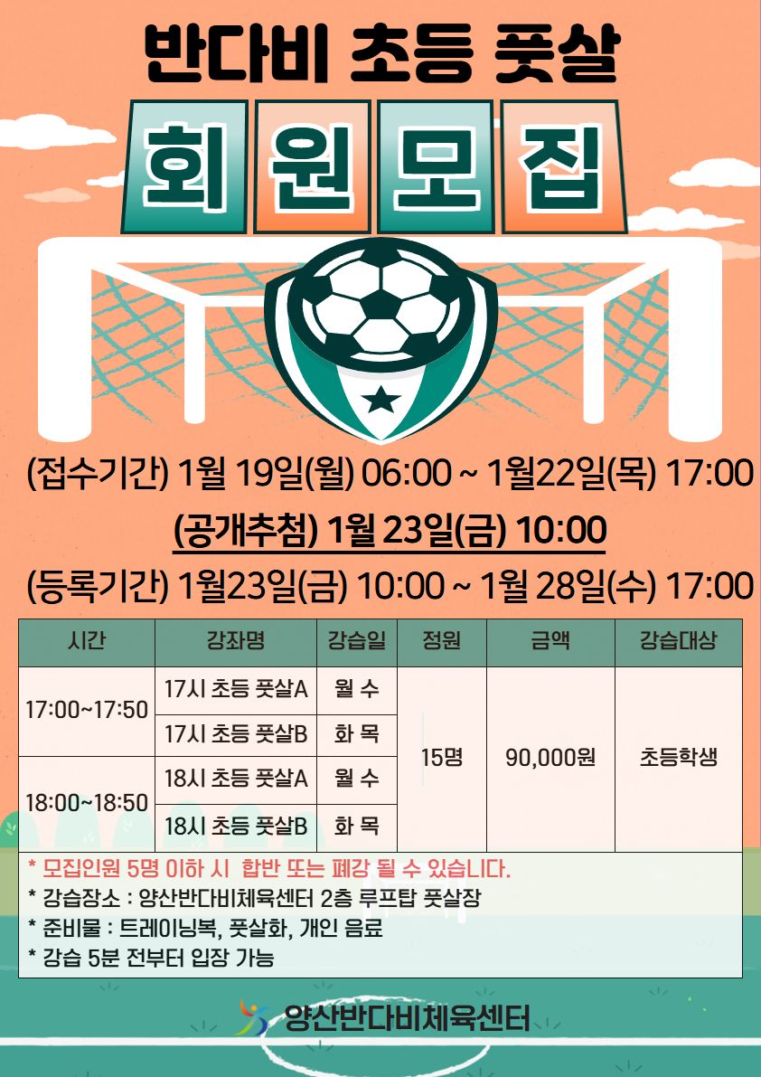 반다비체육센터 루프탑 풋살장 신규강습 공개추첨 안내