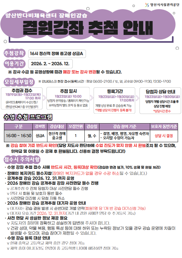 반다비체육센터 수영 장애인 강습 결원강좌 추첨 안내