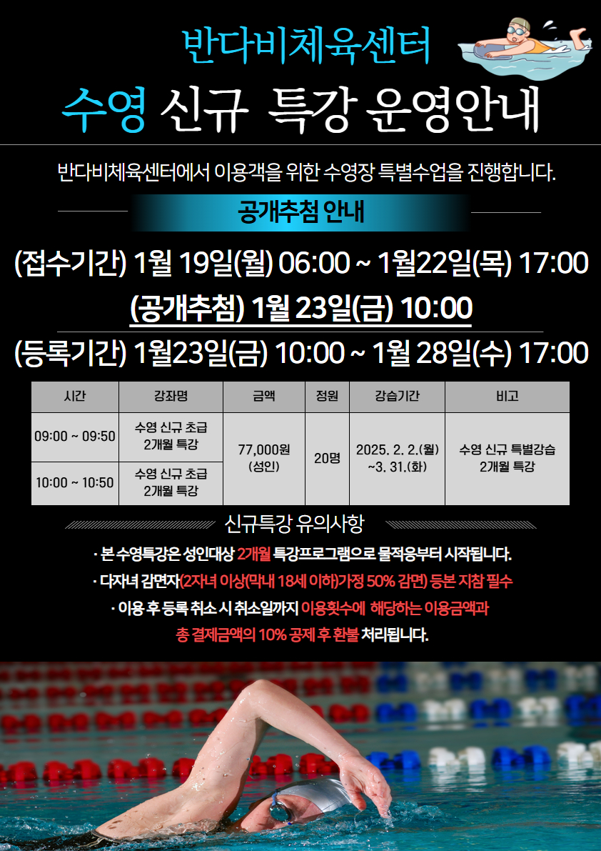 - 추첨종목 : 비장애인 수영 2개월특강(09시, 10시), 장애인 수영(16시 상급A)