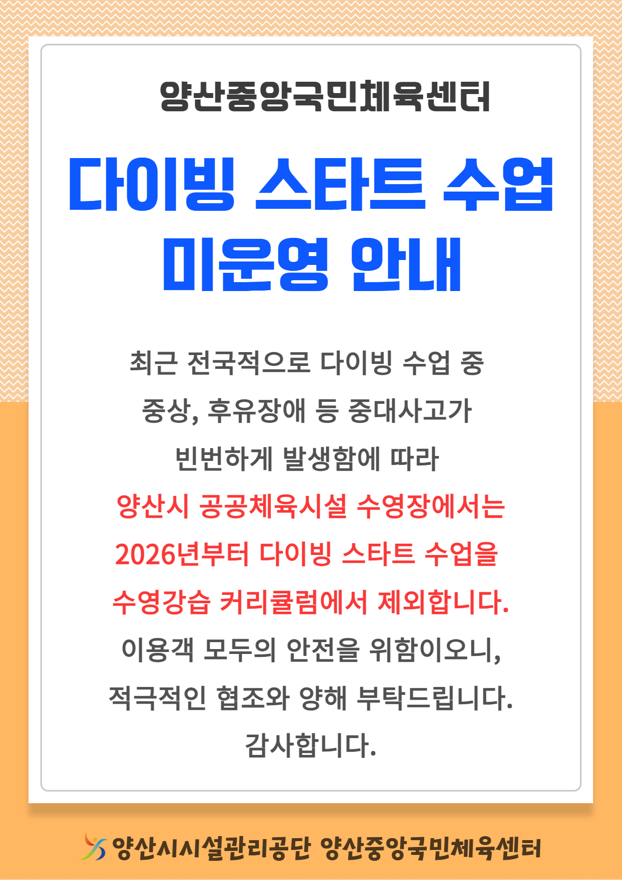 2026년부터 양산시 공공체육시설 수영장에서는 다이빙 스타트 수업을 수영강습 커리큘럼에서 제외합니다.