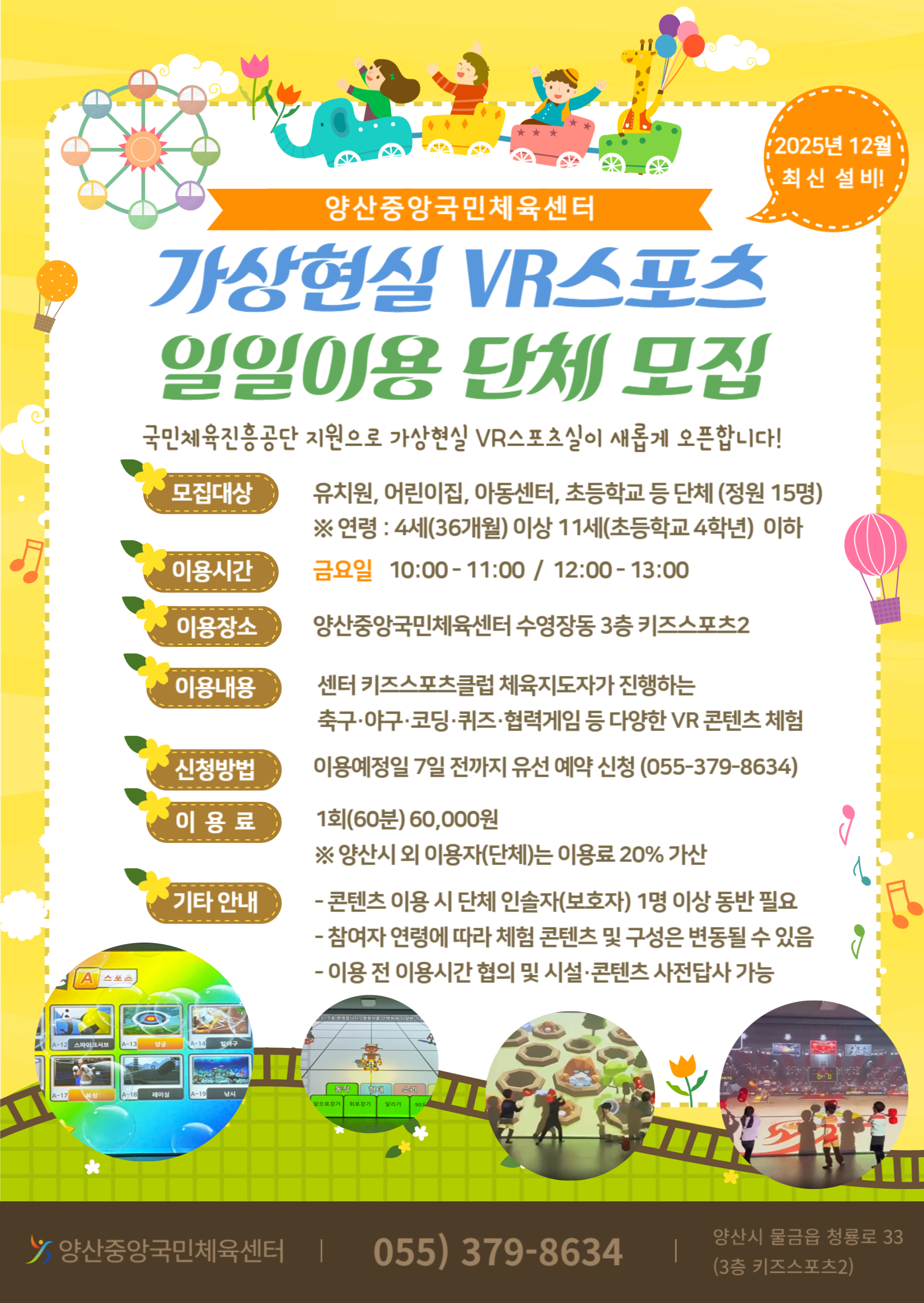 2025년 12월 양산중앙국민체육센터 키즈스포츠2 공간에 가상현실 VR스포츠실이 설비되었습니다.