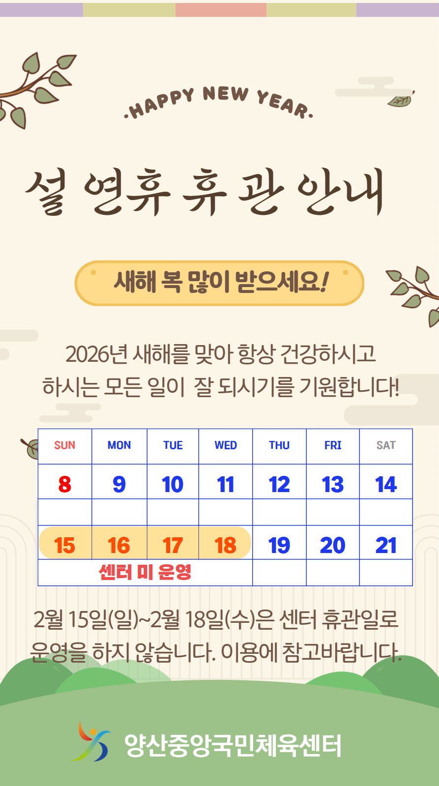 2026. 2. 15.(일) ~ 2. 18.(수) 3주차 일요일 및 설날 연휴는 정기휴관일이오니 센터 이용 및 방문에 참고 부탁드립니다