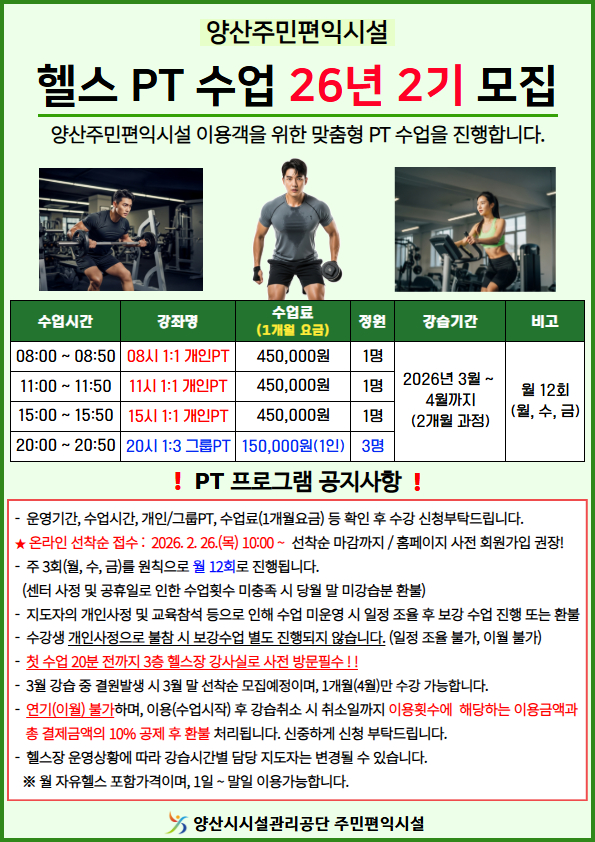 - 자세한 사항은 헬스장 PT 프로그램 모집 안내문 참조
