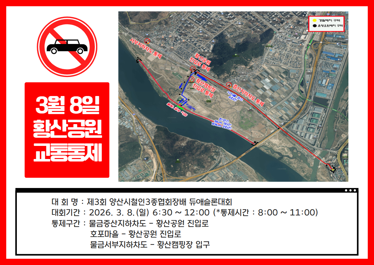 제3회 양산시철인3종협회장배 듀애슬론대회 개최에 따라 황산공원 차량 통행이 통제될 예정이오니 시설 이용에 참고 바랍니다.