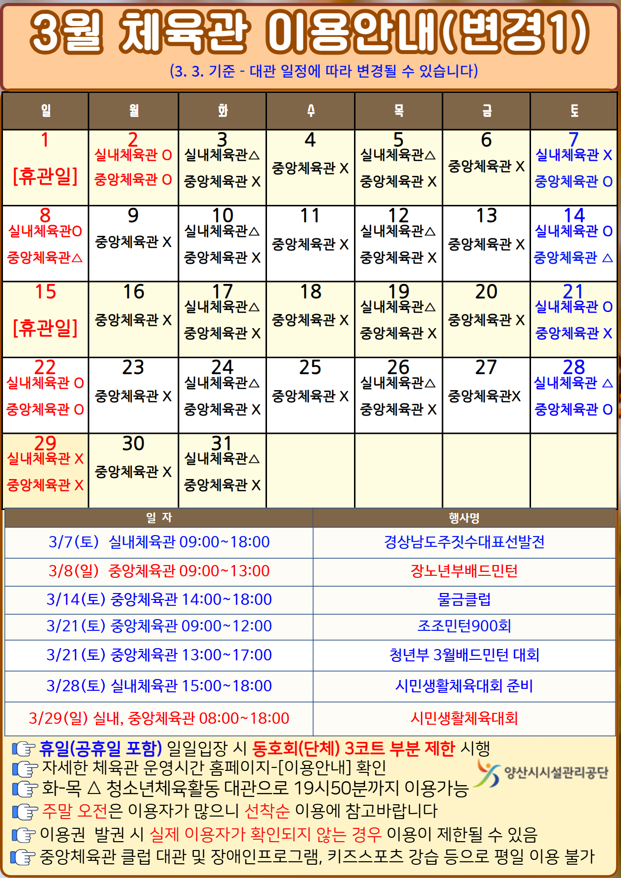 2026년 3월 양산중앙국민체육센터의 실내체육관 및 양산중앙체육관 이용 안내드립니다.화-목요일 청소년체육활동시 일정관련 협의를 통해 19시50분까지 일일입장이용 가능합니다.평일 중앙체육관은 클럽 대관 및 장애인 프로그램, 키즈스포츠클럽 강습 등으로 이용이 불가합니다.방문 전 일별 체육관 개방시간을 확인 후 이용바랍니다.감사합니다.