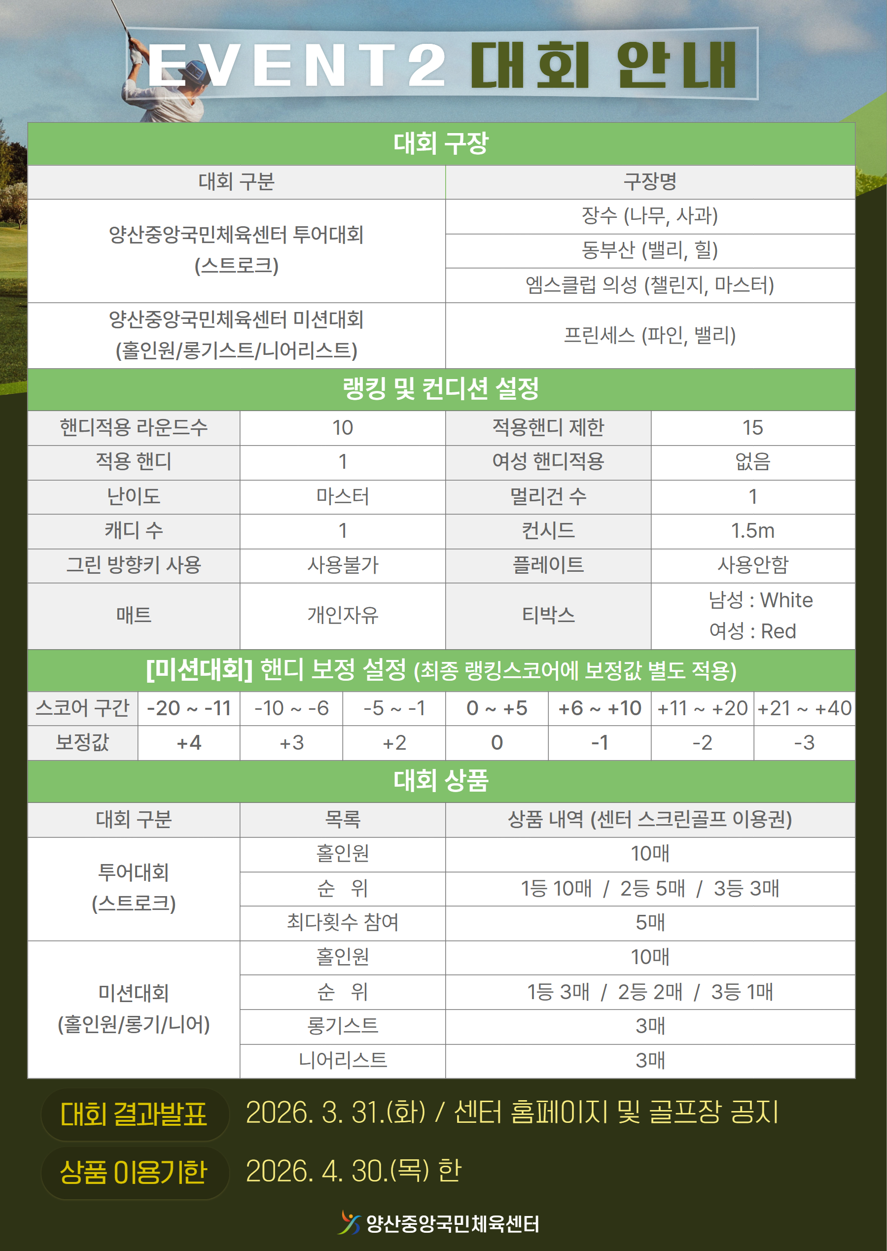 - 대회 종류 : 투어대회(스트로크), 미션대회(홀인원, 롱기스트, 니어리스트)