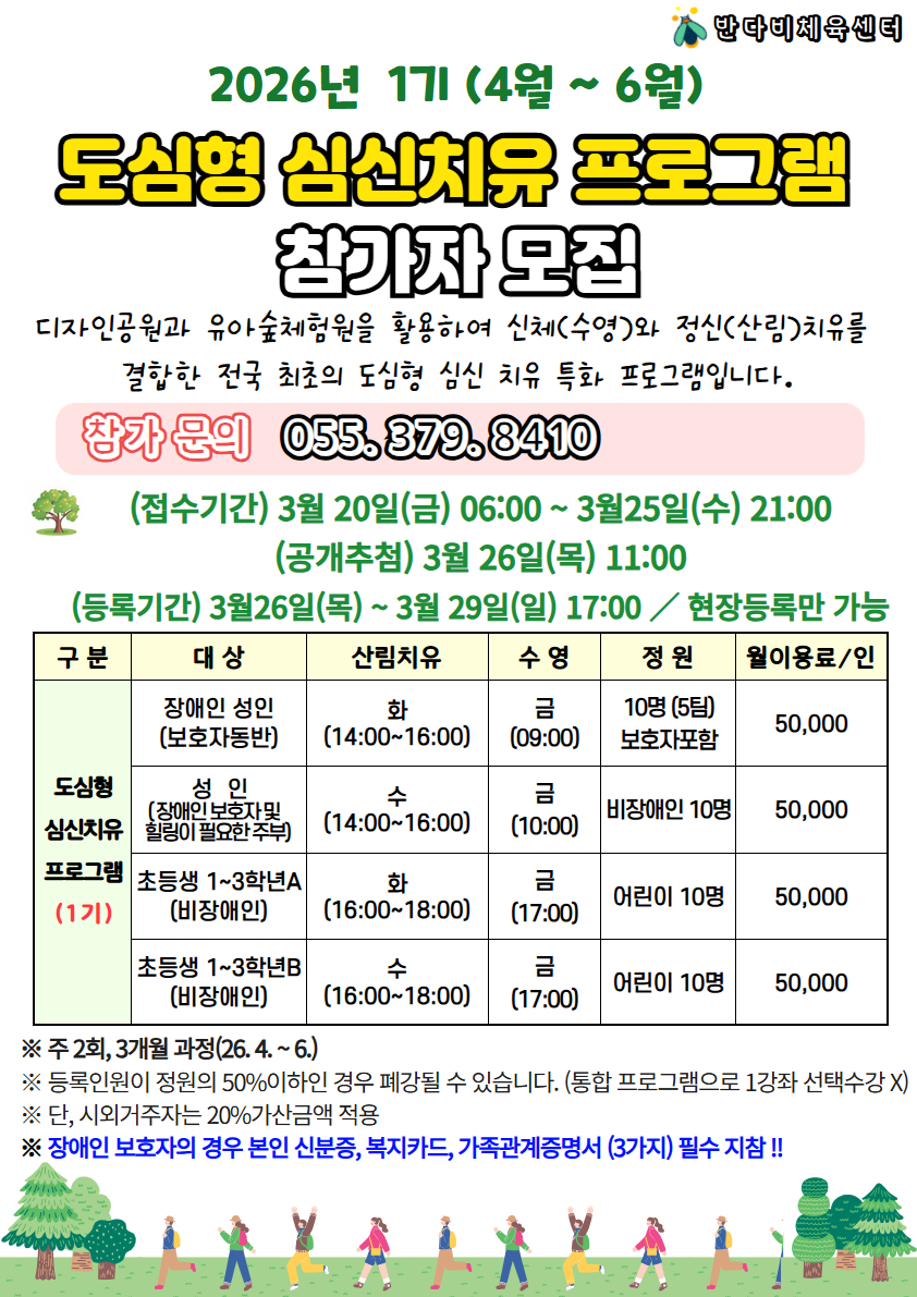 반다비체육센터 도심형 심신치유 프로그램 회원모집과 관련하여 아래와 같이 안내드립니다.