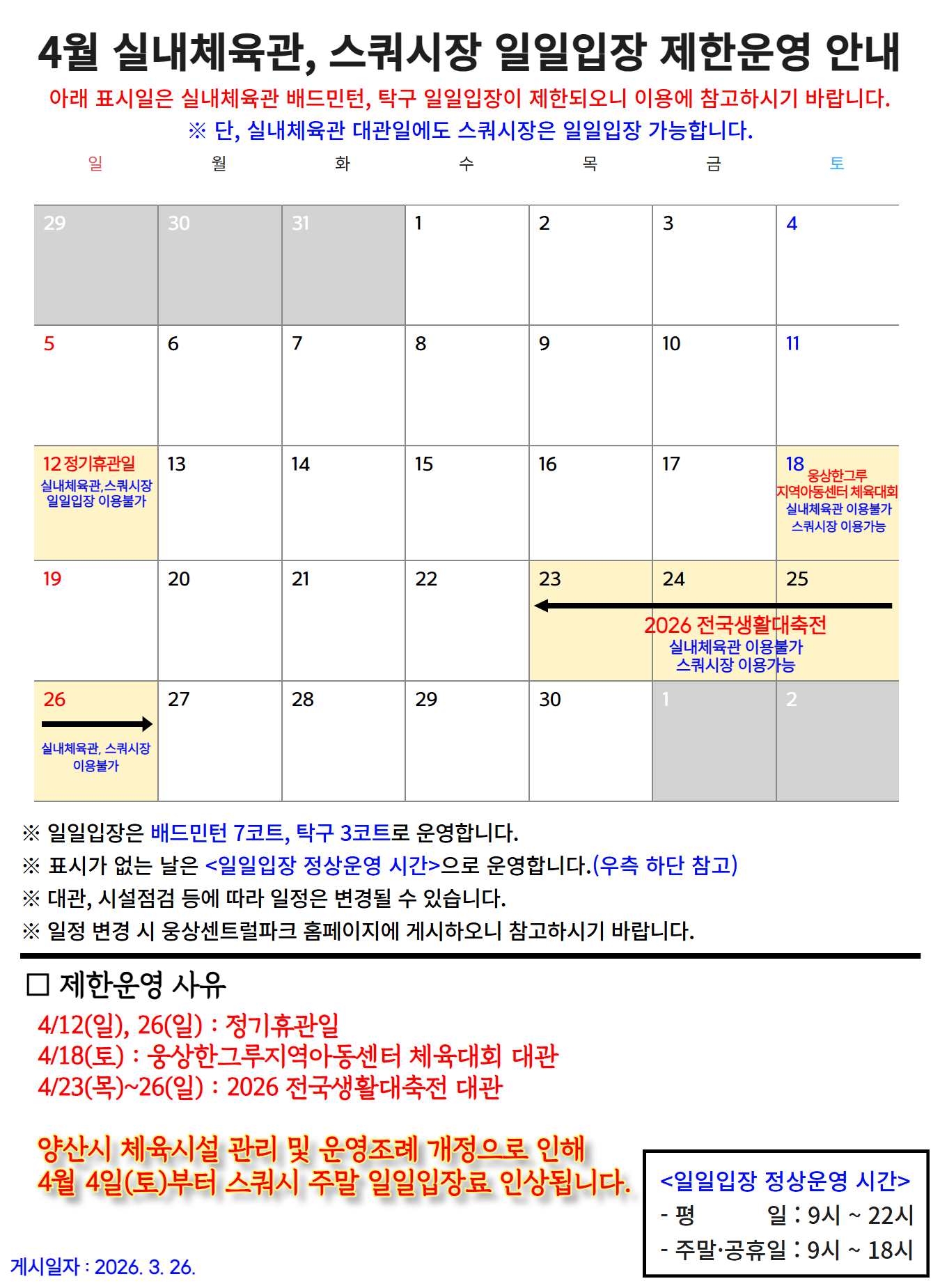 2026년 4월 실내체육관, 스쿼시장 일일입장 제한 안내드립니다