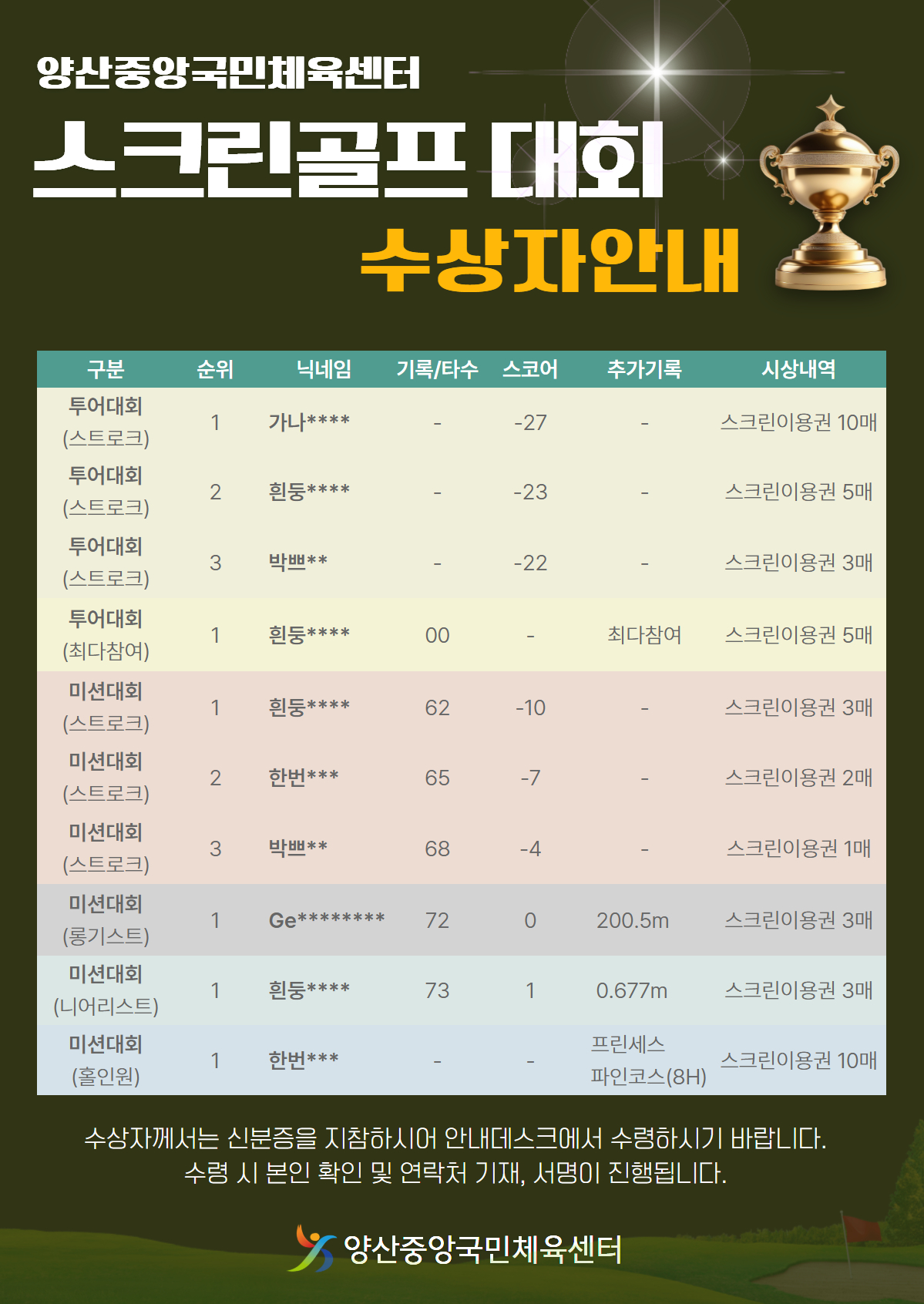 수상자께서는 신분증을 지참하시어 1층 안내데스크에서 시상품(스크린골프 이용권)을 수령해 주시기 바랍니다.