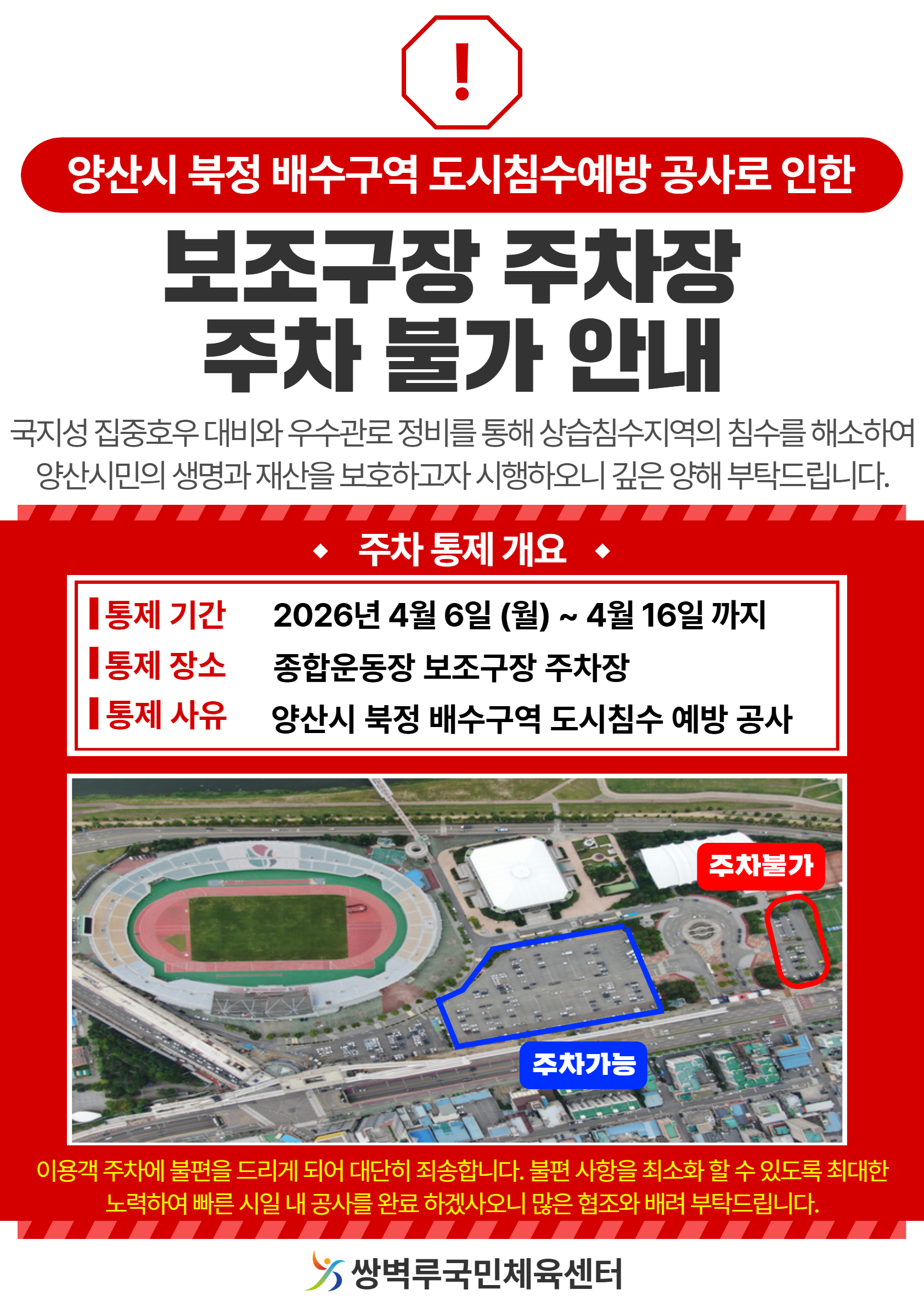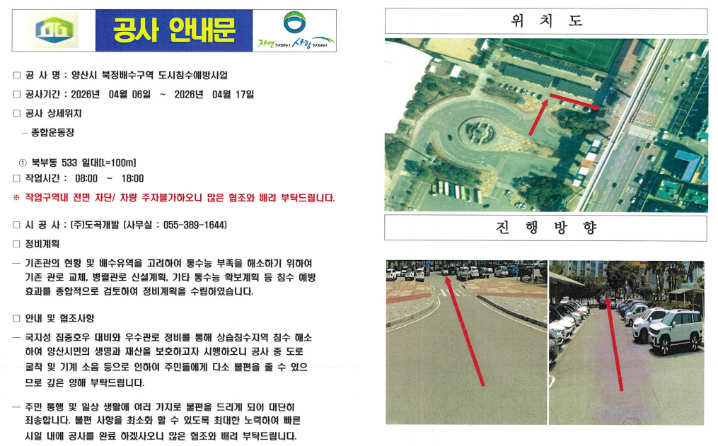 양산시 북정 배수구역 도시침수 예방 공사로 인한 보조구장 주차장 주차 불가 안내