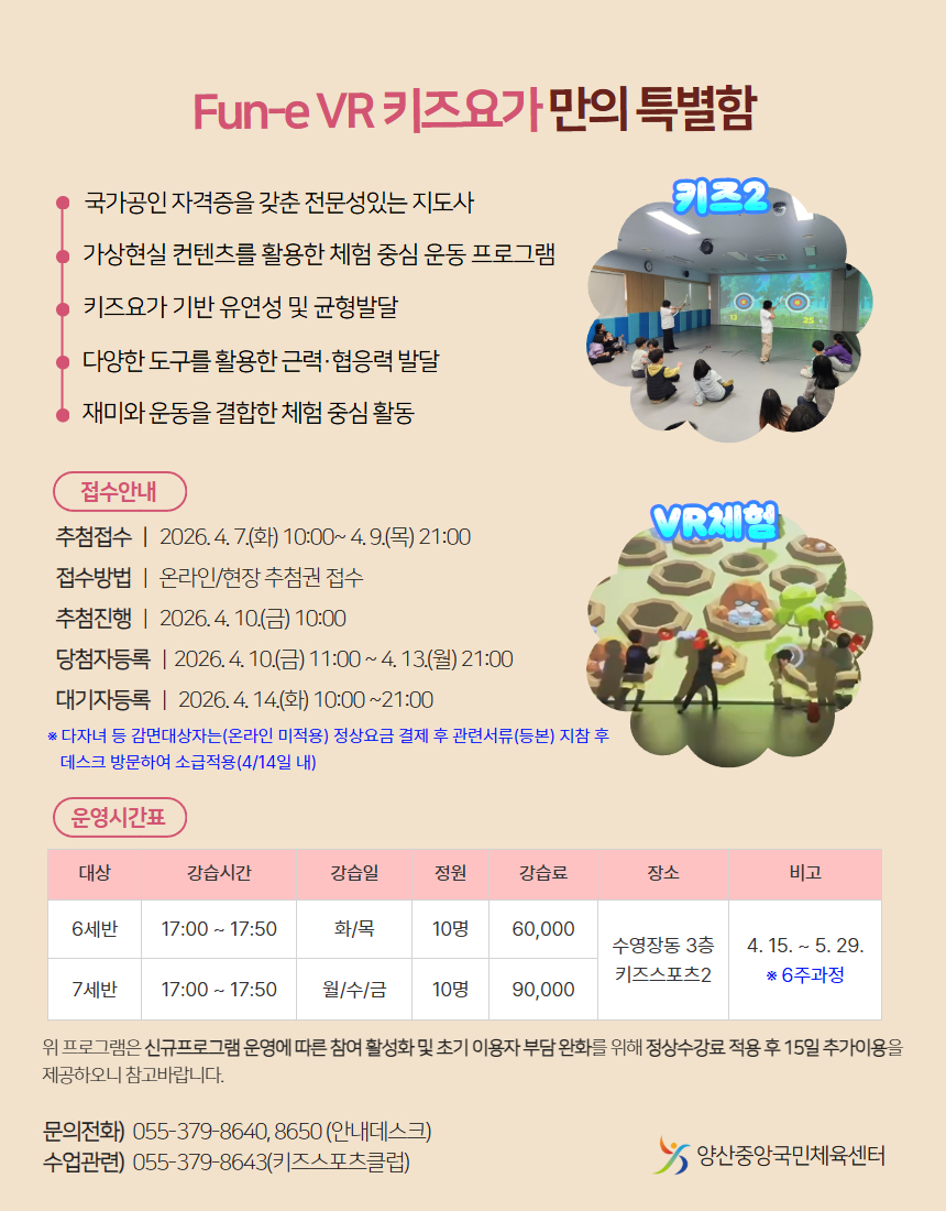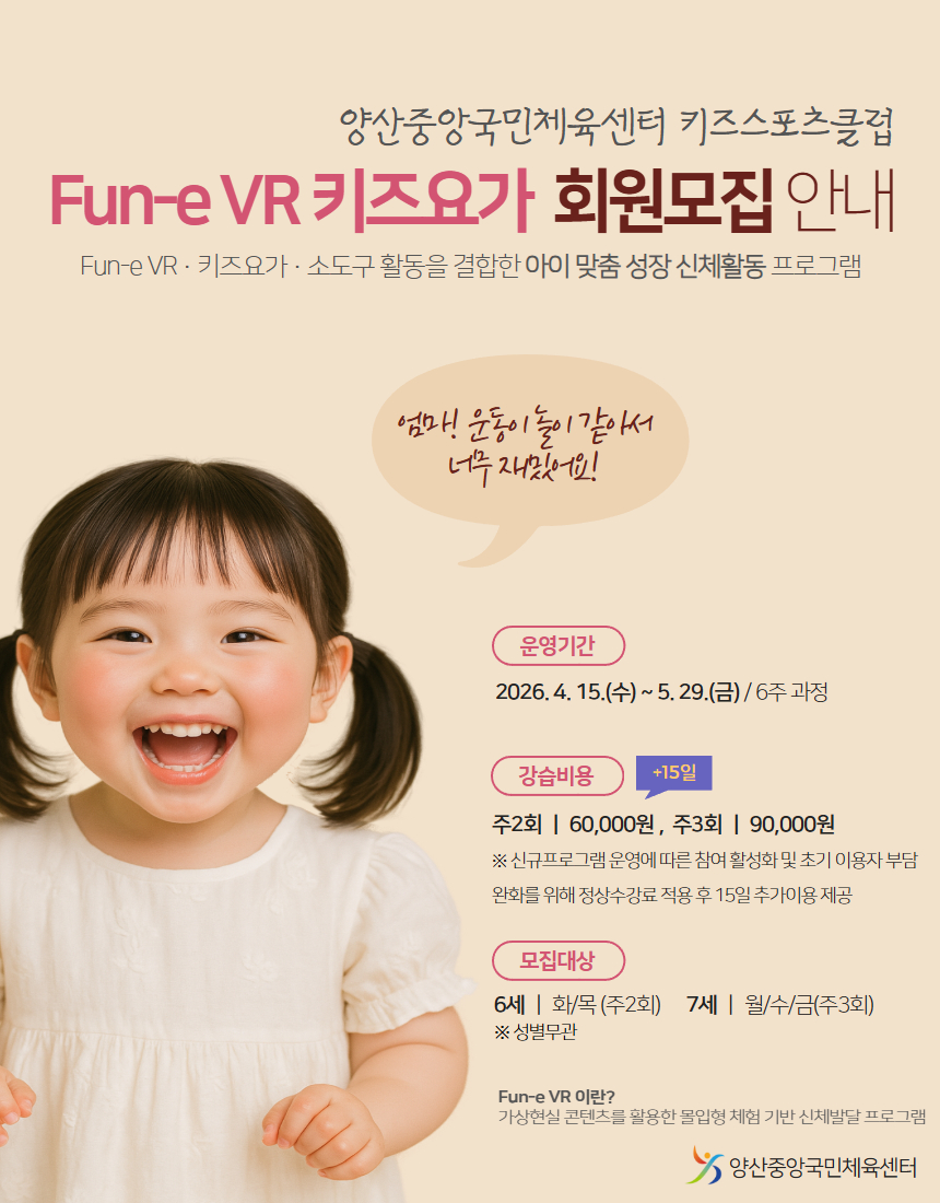 양산중앙국민체육센터 「Fun-e VR 키즈요가」 특강 프로그램 참가자를 모집하오니 많은 관심바랍니다.