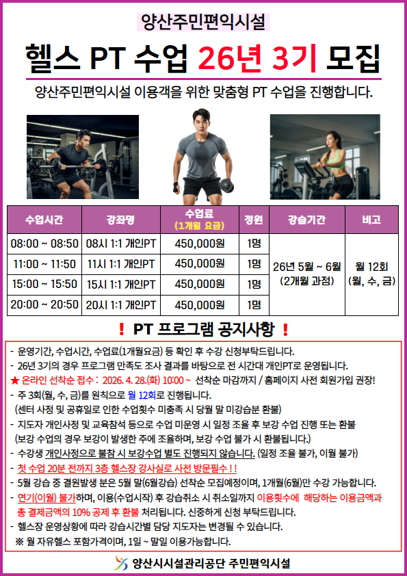 ● 헬스장 PT프로그램 26년 3기 신규 선착순 모집안내(별도 모집안내문 참조)