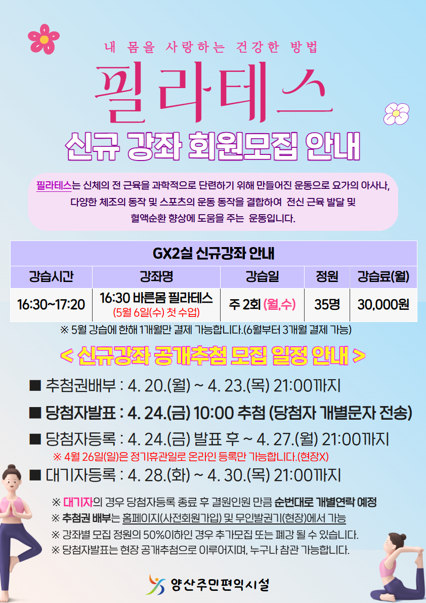 - 추 첨 강 좌 : 16시30분 바른몸필라테스 / 월, 수(주2회)