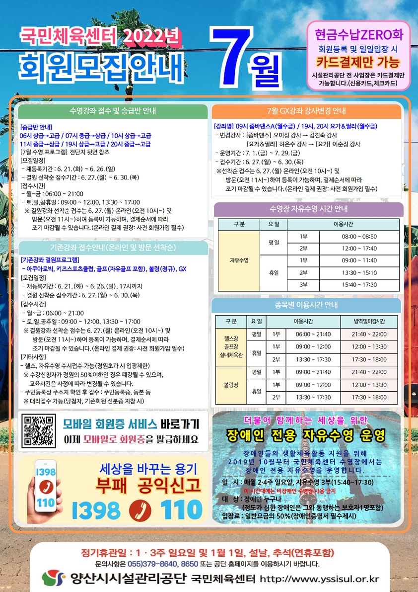 국민체육센터 7월 회원모집 일정 및 정기휴관일 안내