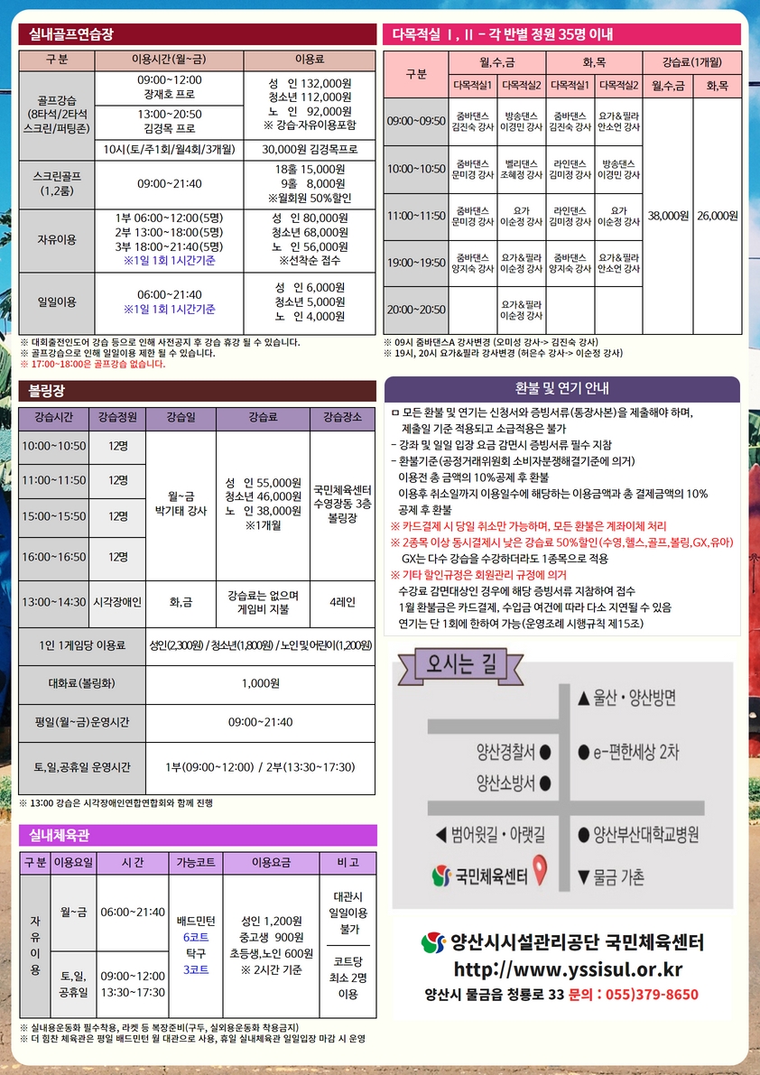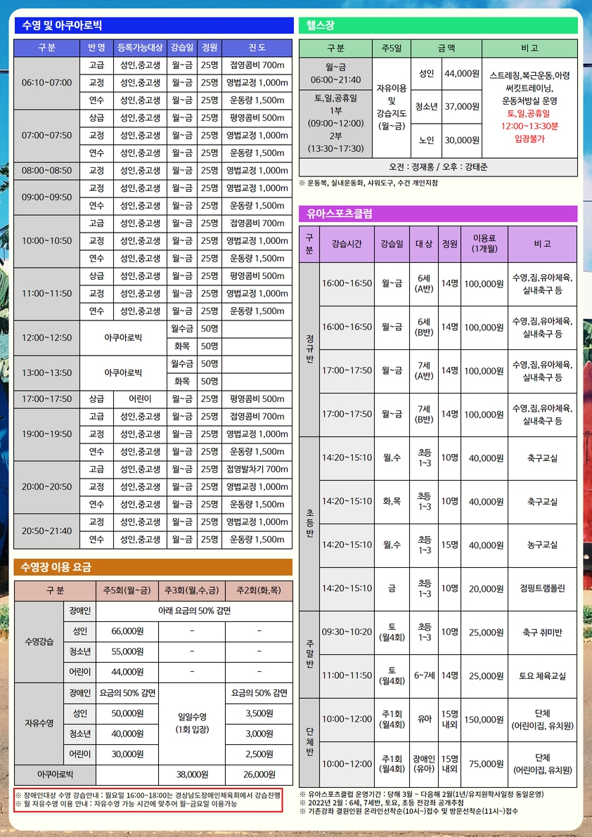 - 모집강좌 : 수영, 아쿠아로빅, 유아스포츠클럽, 골프(자유골프 포함), 볼링, GX