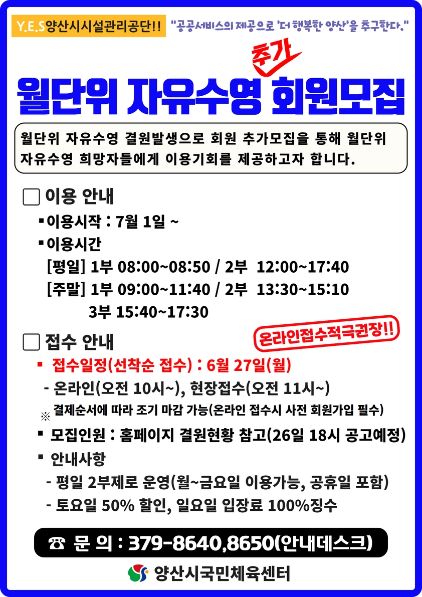 월단위 자유수영 결원발생으로 회원 추가모집을 통해 월단위 자유수영 희망자들에게 이용기회를 제공하고자 합니다.