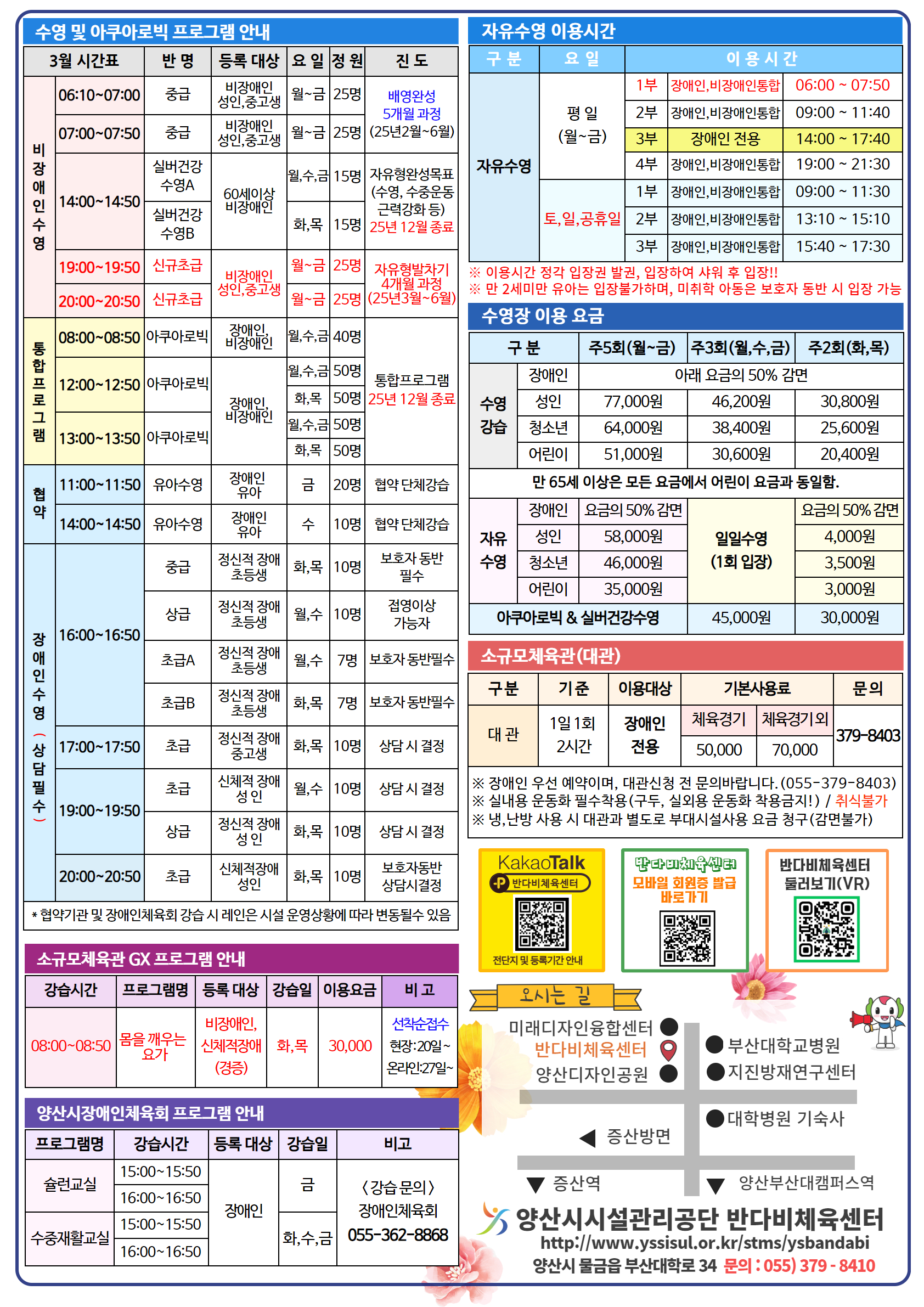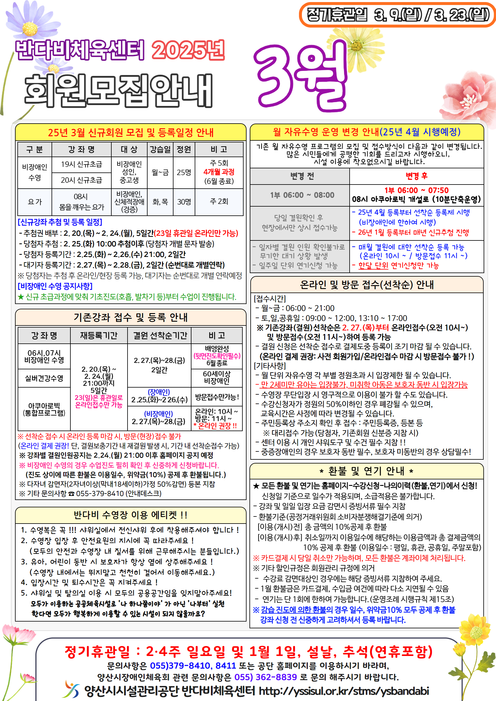 반다비체육센터 2025년 3월 회원모집 일정 및 정기휴관일 안내