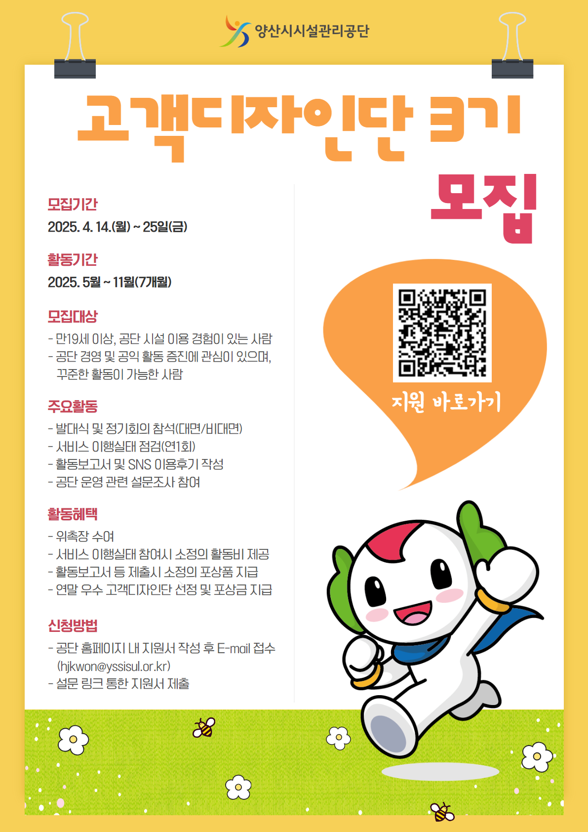 모집기간은 4월 14일(월)부터 4월 25일(금)까지이며, 공단 홈페이지에서 지원서를 내려받아 이메일(hjkwon@yssisul.or.kr)로 제출하거나 온라인 설문 링크를 통해서도 접수할 수 있다. (문의:인사혁신팀 ☎ 055-379-8496)