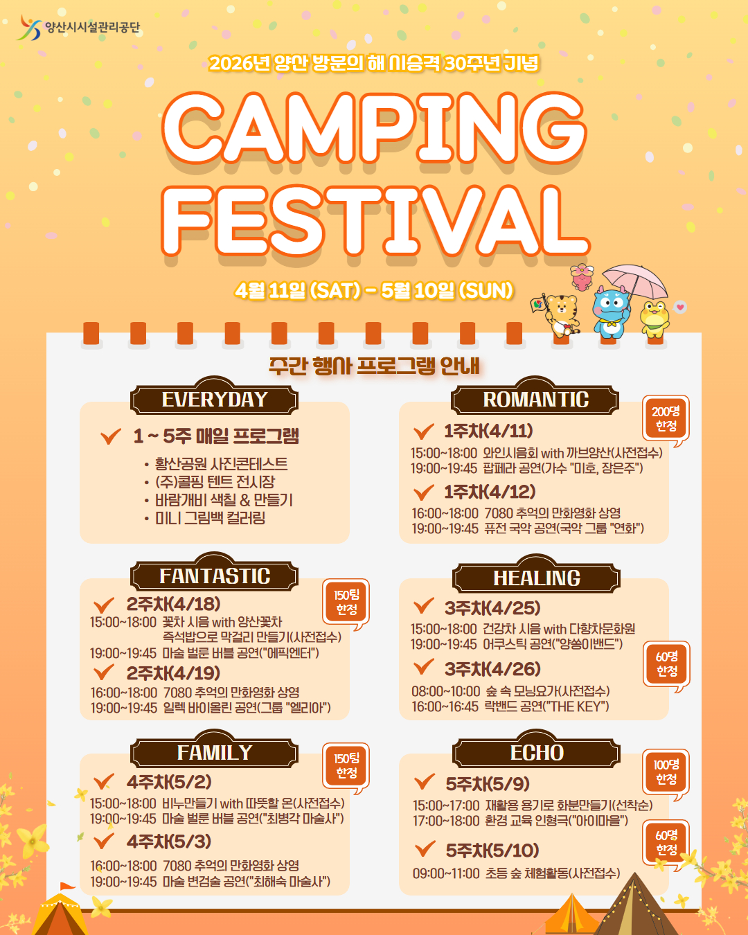 - 4월 11일부터 5월 10일까지 5주간, 캠핑과 문화가 어우러진 축제 운영 -