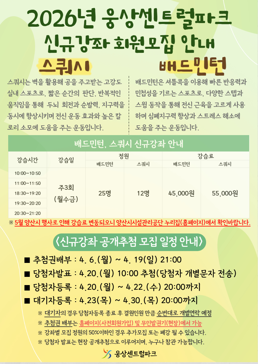 양산시시설관리공단(이사장 박성관) 웅상센트럴파크는 시민 건강 증진과 다양한 체육활동 기회 제공을 위해 오는 5월부터 배드민턴 및 스쿼시 신규 강좌를 개설하고, 공개추첨 방식으로 수강생을 모집한다고 밝혔다.