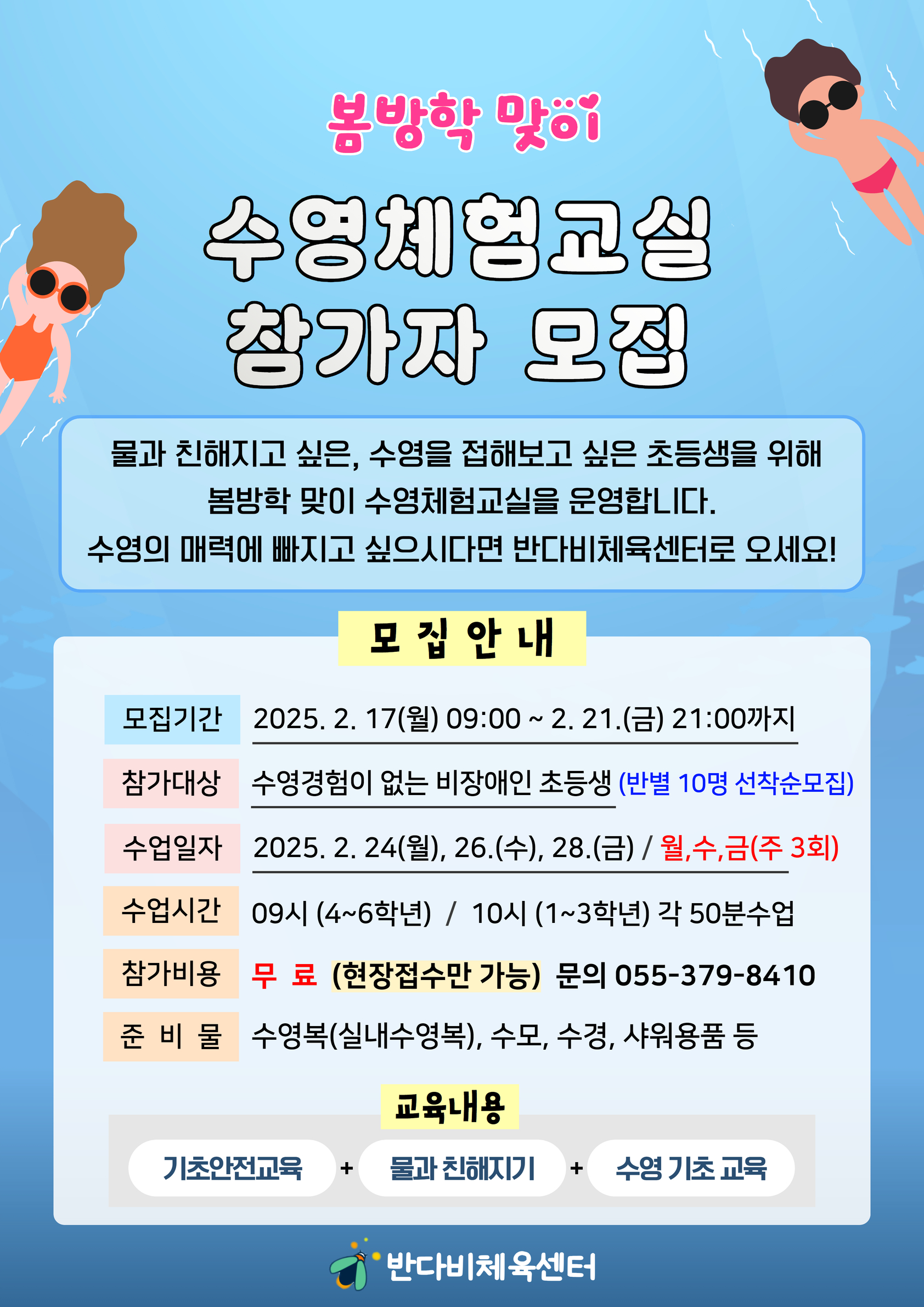 반다비체육센터, 봄방학 맞이 초등학생 대상 무료 수영체험교실 운영