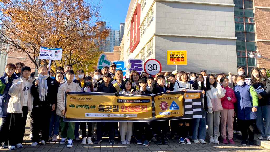 양산시시설관리공단은 지난 21일 양산 성산초등학교 앞에서 민관경이 함께하는 교통안전 캠페인을 진행하였다.