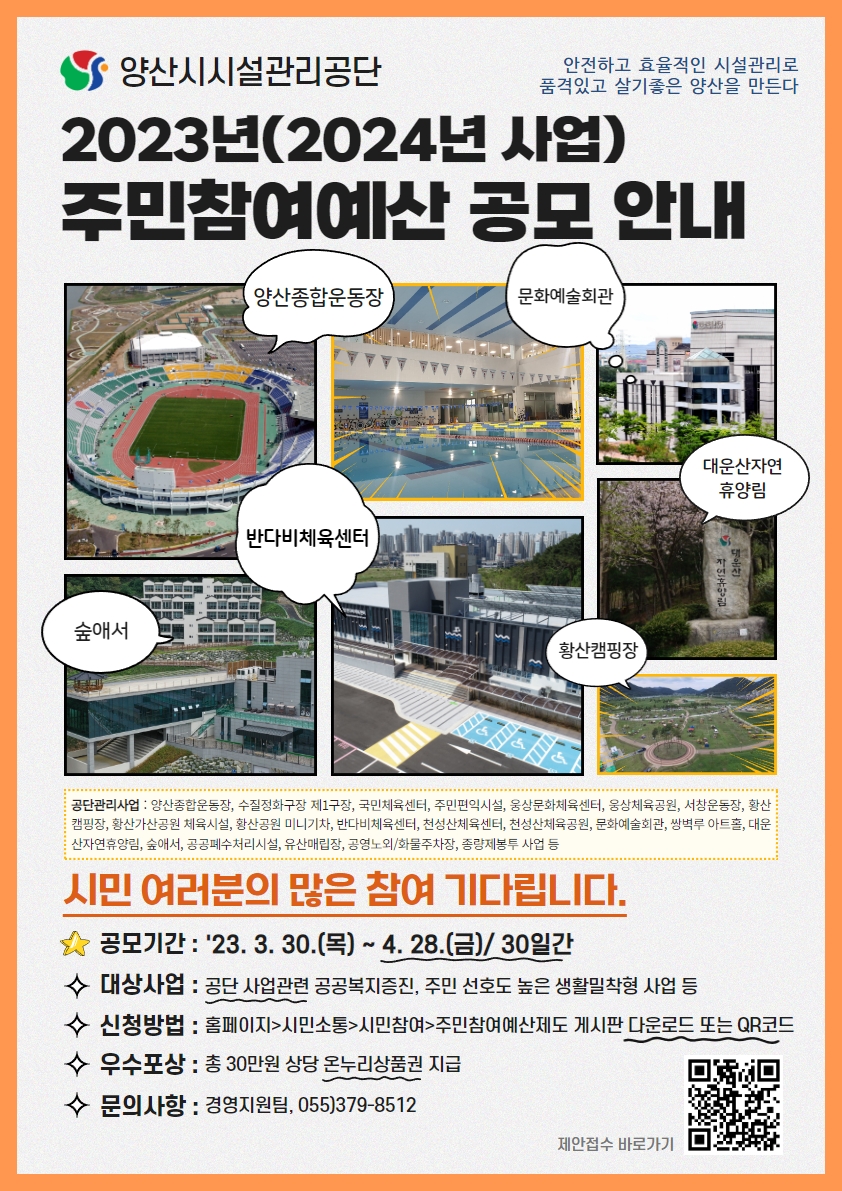 ‘양산시시설관리공단’은 양산시민과 함께 행복한 양산 만들기에 앞장서고 있습니다. 시민들의 참신하고 다양한 아이디어를 통해 공단운영 개선 및 발전을 도모하기 위한 『주민참여예산제 공모』를 실시하오니 많은 참여 바랍니다.